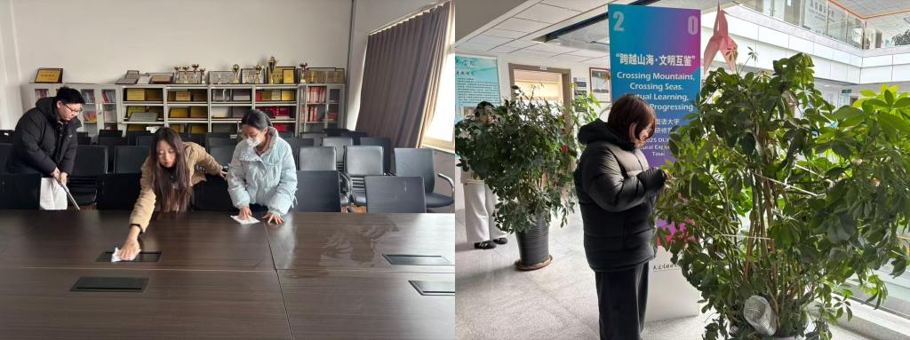 会议室清扫与花卉维护的6名同学也忙得热火朝天。大家擦拭桌面、清理卫生死角,并为绿植浇水修剪,让会议室焕发出整洁温馨的氛围,为桃子视频
